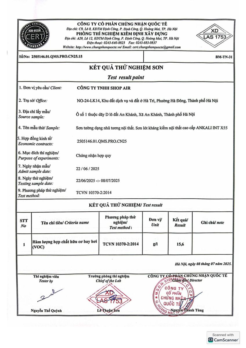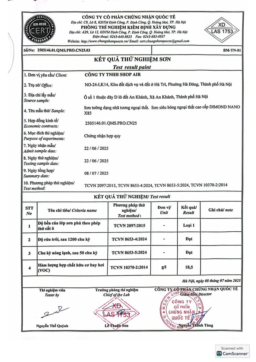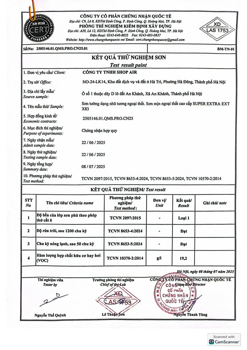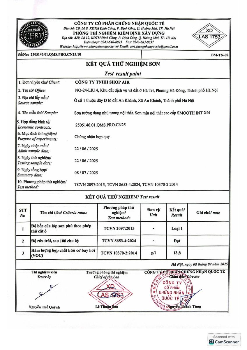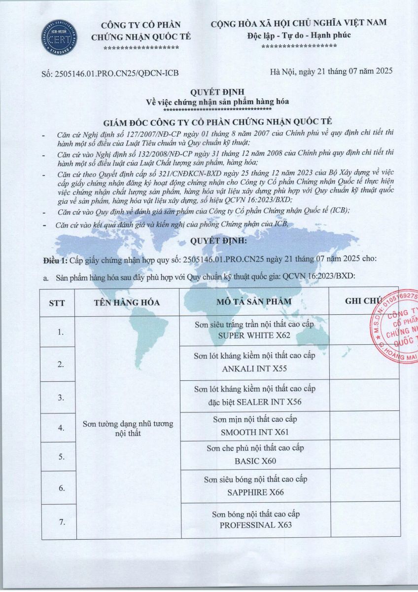 Các loại sơn này đã được kiểm định và chứng nhận chất lượng bởi các tổ chức uy tín, đảm bảo tuân thủ các tiêu chuẩn khắt khe. Với chứng chỉ ISO 1900:2015 và QCVN 16:2023/BXD, người tiêu dùng hoàn toàn có thể yên tâm về độ an toàn và hiệu quả sử dụng.